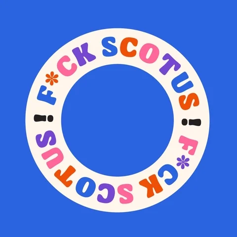 Digital art gif. White donut shape rests over a bright blue background, featuring the colorful scrolling capitalized message, “F*CK SCOTUS! F*CK SCOTUS!”See more america GIFs